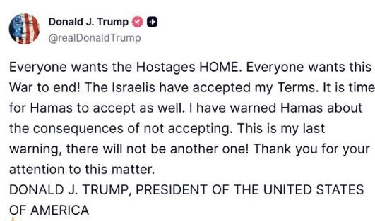 • Trump Issues Final Warning to Hamas on Israeli Hostages